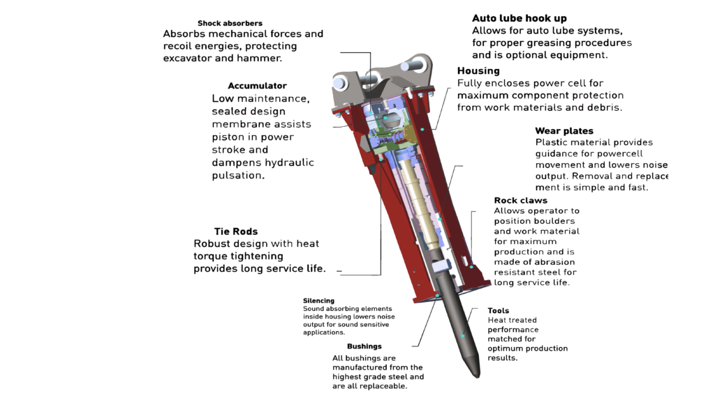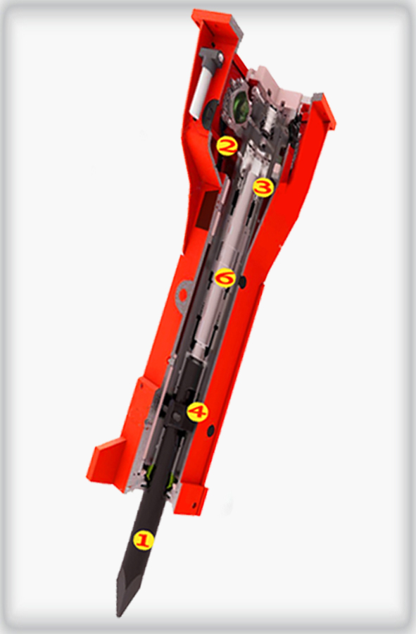 - Accumulator-Creates additional impact power and releases stress on the hydraulic pump.